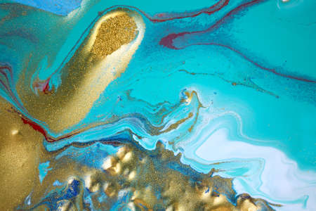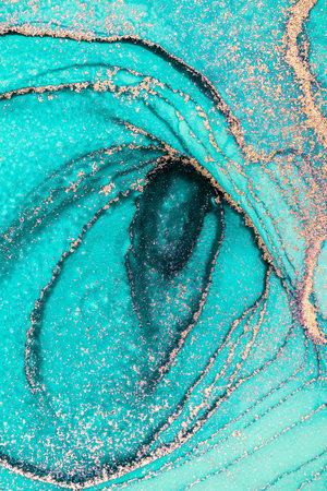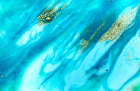 Abstract fluid art background light blue and golden glitter colors. Liquid marble. Acrylic painting on canvas with turquoise gradient. Watercolor backdrop with striped sapphire pattern. Stone section.
