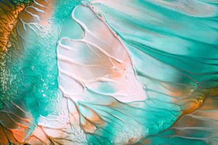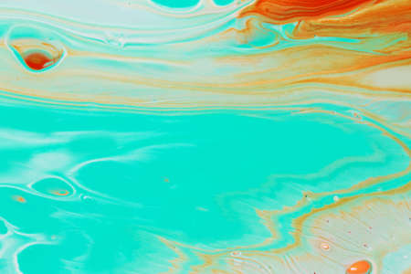 Abstract background of acrylic paints in aquamarine and orange color tones