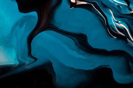 Abstract fluid art background navy blue and black colors. Liquid marble. Acrylic painting on canvas with turquoise gradient and splash. Alcohol ink backdrop with waves pattern.