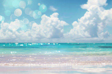 Blurred background of a beautiful beach with a blue sky and white clouds.