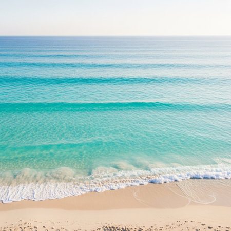 Serene Shoreline aerial view: Pristine Sandy Beach Meeting Gentle Turquoise Waves