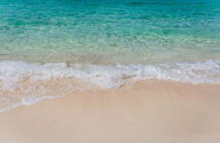 Close up blue sea water waves on white sand beach in Thailand, Beautiful blue sea beach with white sand, Beautiful blue ocean beach close up shot, Clean beach with blue sea in Thailand