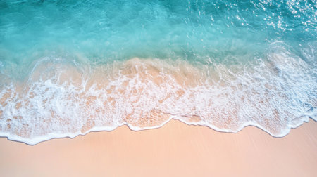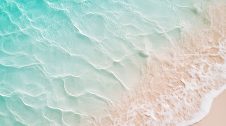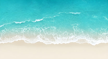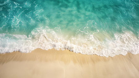 Experience the calming beauty of turquoise ocean waves gently washing onto a sandy beach. This serene aerial view invites a sense of relaxation and tranquility.