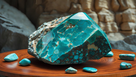close up of a piece of turquoise on a light wood table, created with generative ai