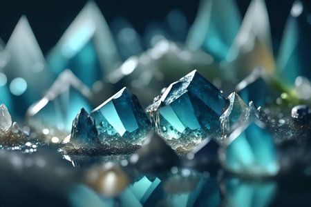 3d rendering of blue crystals in abstract background with depth of field