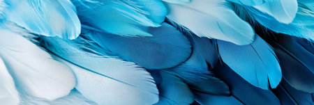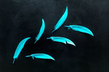 Beautiful feathers background in bright blue colors. Closeup image of colorful fluffy feather. Minimal abstract composition with place for text.