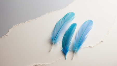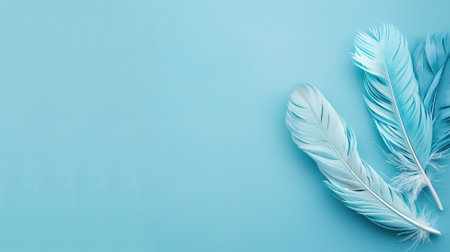 Three delicate light blue feathers on a matching background, arranged diagonally across the frame.