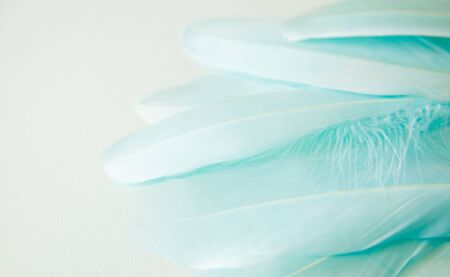 Group of tiny classic blue feathers on light pure background. Fragility and elegance. Copy space for text