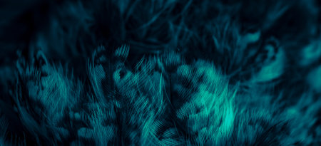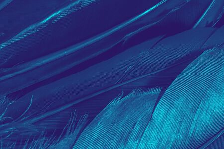 Blue neon bird feathers close-up toning . Abstract trendy texture background. Horizontal frame flat layout.