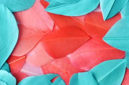 Real feathers trend color living coral and cyan closeup. Color of the year 2019 Pattern for your Design. top view