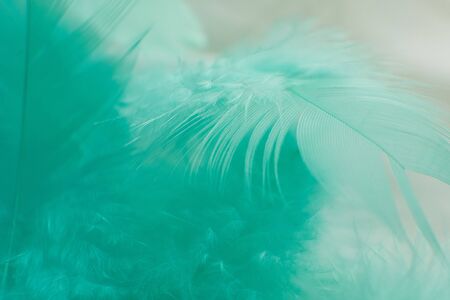 Bird feathers in New Olo color. Rich blue-green color in fluffy carnival feathers close-up, selective focus