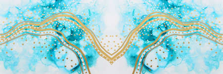 art photography of abstract fluid painting with alcohol ink, blue and gold colors
