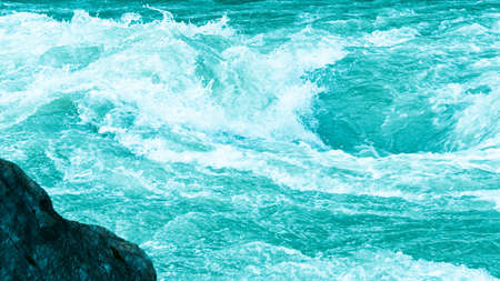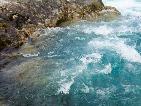Blue bubbling water of mountain river. Ocean tide of turquoise sea