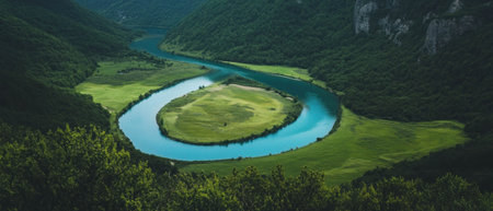 Winding river flows gracefully through lush green valley under bright blue sky