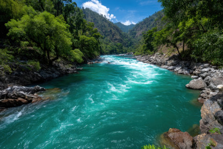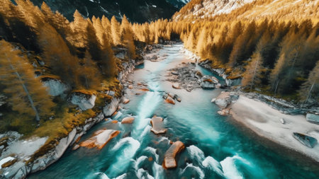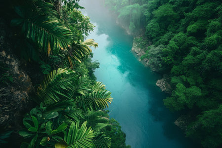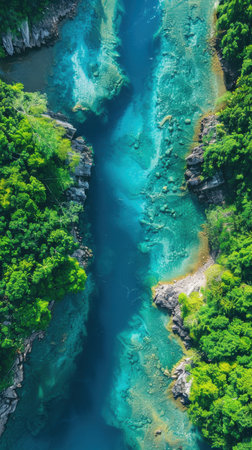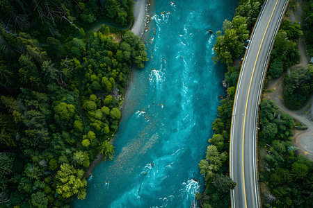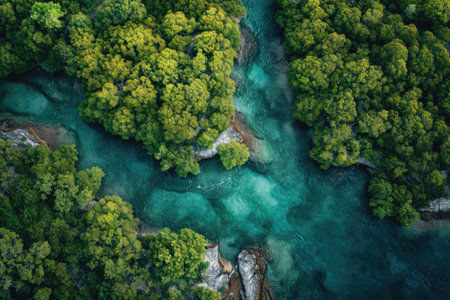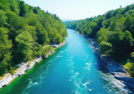 An aerial perspective showcases a river's powerful flow amidst a dense forest. The turquoise water contrasts with the green foliage, creating a dynamic composition. Overhead lighting illuminates the textures of the water and trees. Ideal for illustrating environmental themes and natural beauty, the image suits various editorial or commercial applications.