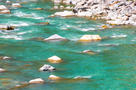 Rough river flow. The blue water of mountain river, the tide on sea with turquoise water and stone banks