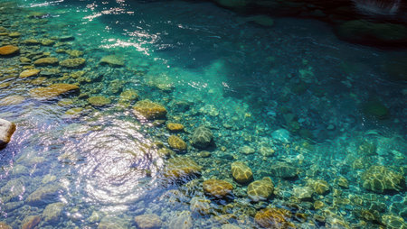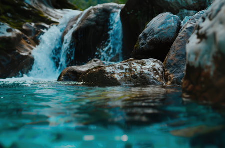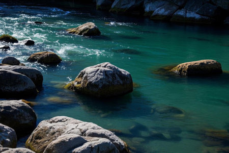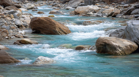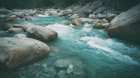 This captivating image showcases a serene river flowing over smooth stones, highlighting the clear turquoise water amidst a rocky landscape that invites tranquility.