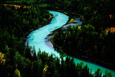Panoramic view of the turquoise river and coniferous forest