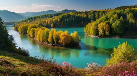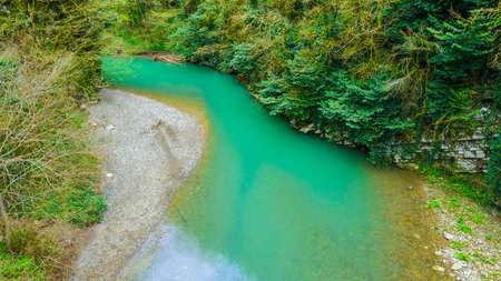 Beautiful landscape with turquoise river and trees in the forest