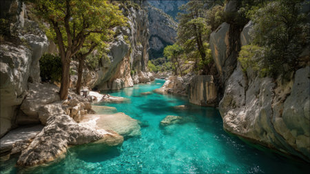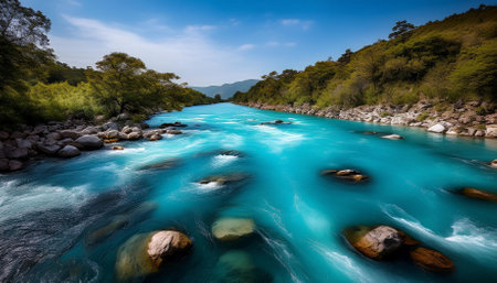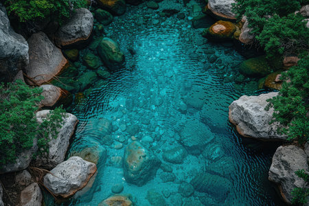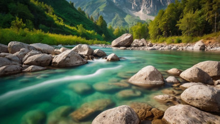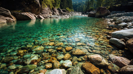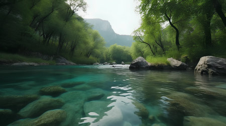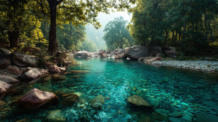 Experience a peaceful river landscape featuring crystal clear turquoise water set against smooth stones and lush green trees, perfect for nature lovers and explorers.