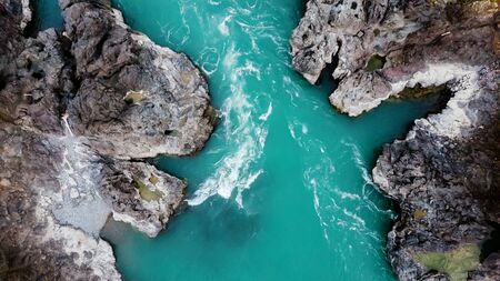 Mountain turquoise river, rocky banks aerial view. Drone shooting. Katun River, Altai