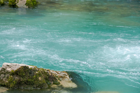 A beautiful green narrow gorge with a turquoise river in Tolmin, Slovenia. Long exposure photo of water flowing over narrow rocks.