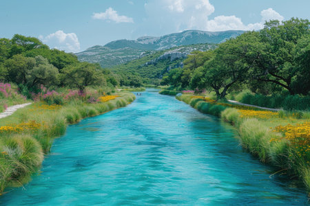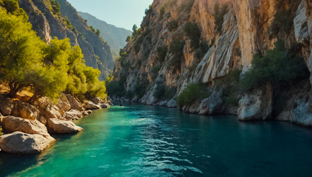 A tranquil river flows through stunning cliffs and vibrant greenery reflecting natures beauty.