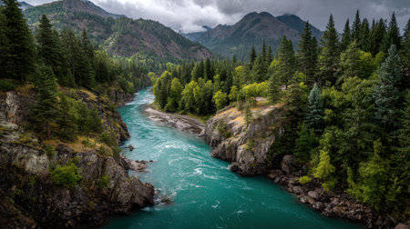 Serene River Winding Through Lush Green Forests Amidst Dramatic Mountain Landscape Under Overcast Sky in Nature's Breathtaking Beauty