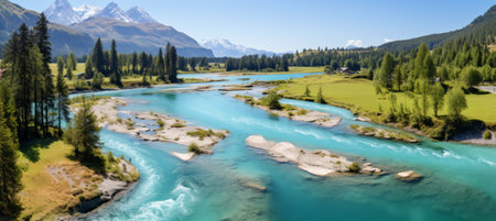 an aerial view captures the mesmerizing flow of blue water amidst majestic mountains, reminiscent of the swiss style. the dark aquamarine and green hues create a visually stunning scene, enhanced by the use of kodak plus-x film. this photograph by andreas rocha is a joyful celebration of nature, with minimalist backgrounds that showcase the beauty of the landscape. available in 32k uhd resolution. ai generated