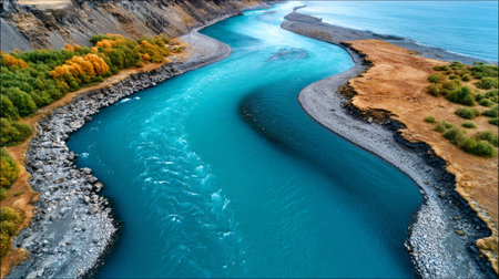 An aerial depiction shows a vibrant turquoise river carving through a landscape dominated by patches of green vegetation. The composition suggests a top-down perspective, highlighting the waterways and the natural environment. The image's color palette creates a dynamic and appealing scene. Potential uses include editorial illustrations or environmental concepts.