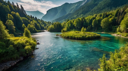 This scene showcases a stunning winding river flowing through a vibrant green forest. The water reflects the clear sky, enhancing the tranquil beauty of this untouched nature spot.