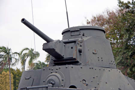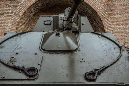 Parts of the hull of the old tank in the museum of military vehicles outdoor in the open air. Gun and truck parts closeup view.