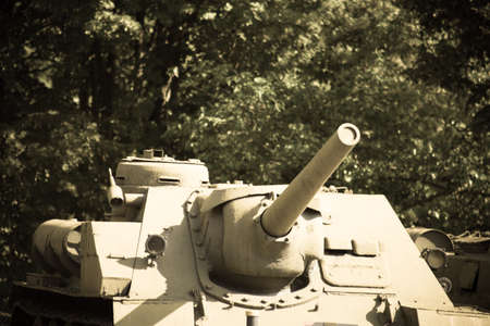Tank gun on green tree and white sky background. It is on the tank, a heavy armored fighting vehicle carrying guns and moving on a continuous articulated metal track.