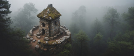 AI Generated. Aerial View of an Ancient Stone Structure in a Foggy Forest
