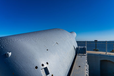 Houston, Texas, USA - December 27, 2016: Battleship USS Texas BB-35, is a museum ship near Houston, and a National Historic Landmark, close up of her main Battery