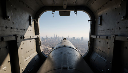 A striking scene shows a military turret overlooking a vibrant city skyline. The turret frames the view of buildings and clear skies, creating an intriguing contrast of military and urban life.
