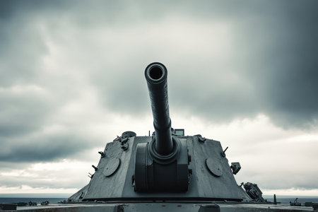 Tank overlooking the horizon under a dramatic cloudy sky, evoking a sense of military presence and history.