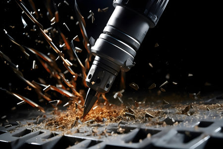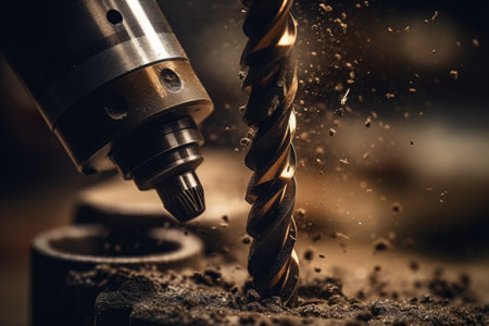 A captivating close-up image of a power drill bit in action as it penetrates the soil, sending up sparks and debris, showcasing construction dynamics.