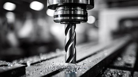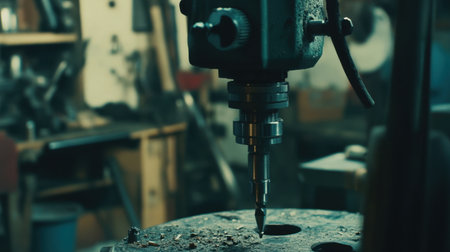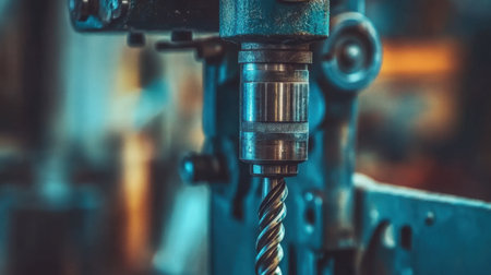 A detailed close-up of an industrial drill machine featuring a twisted drill bit. The setting highlights the workshop atmosphere, showcasing precision tools.