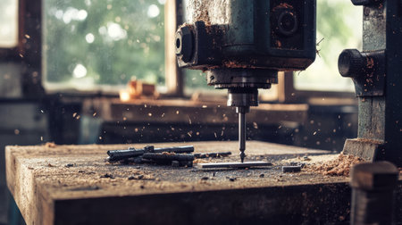 A detailed close-up of a vintage drill press located in a workshop, showcasing the spinning bit and surrounding wood shavings, emphasizing craftsmanship.