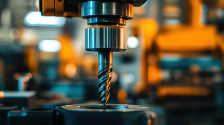 Sharp cnc drill bit in focus against blurred background of intricate machine workings