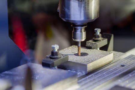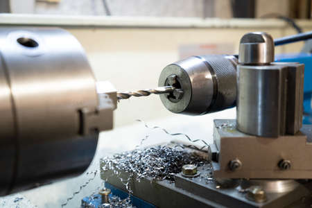 Closeup scene the lathe machine hole cutting the metal parts by drill tools. The metalworking process by turning machine.