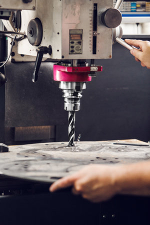 Worker hand working on milling machine to change metal drill bit. Tool for drilling metal workpiece. Milling machine. Steel manufacturing industry. Metal work industry. Industrial drilling machine.