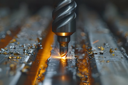 High precision cnc machine performing a metal cutting process on a metallic surface. sparks fly as the sharp drill bit penetrates the material, demonstrating the efficiency and accuracy of modern industrial manufacturing technology. Generative AI