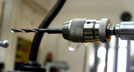 Drill close-up for metal and iron drilling industrial work tool.