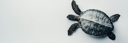 A turtle displays its unique patterned shell while swimming leisurely over a clean, minimalist white background in this top-down perspective.