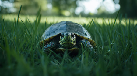 A captivating close-up of a turtle leisurely crawling through vibrant green grass. This serene image evokes a sense of tranquility and showcases the beauty of wildlife in a natural setting. Perfect for nature enthusiasts and animal lovers.
