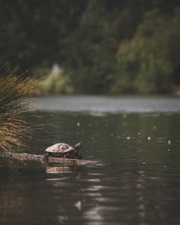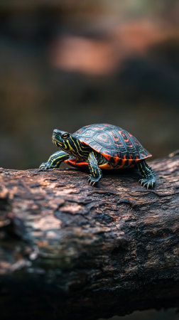 Painted turtle on a log in natural habitat, focused animal wildlife concept