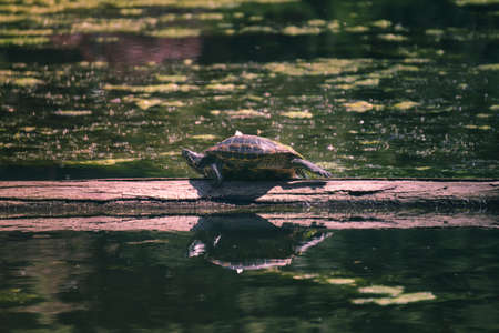 Lonely turtle found by the lake in nature