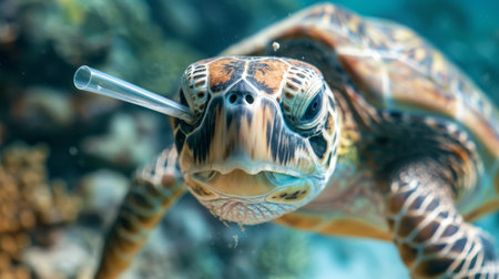Close-up of a sea turtle with a plastic straw stuck in its nostril, symbolizing the impact of pollution on marine life.